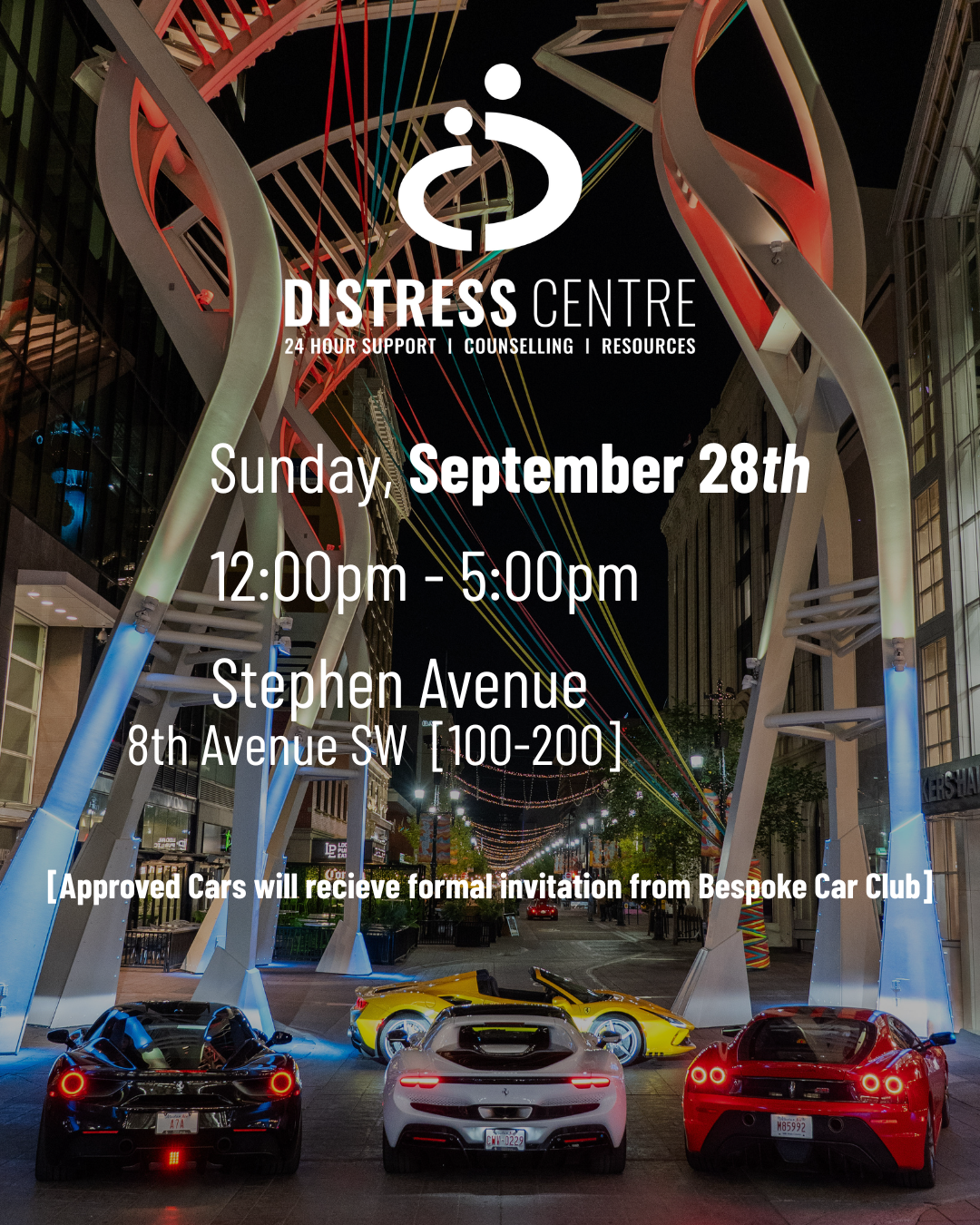 Join us for the Bespoke Grand Finale—the ultimate celebration of Calgary’s car season—as we share our passion for exceptional vehicles and raise funds in support of Distress Centre Calgary. Current Donor Information Payment Complete We have raised $9595.00 of our target $10000.00! Amount 1000 500 100 50 25 Other… Enter other… $ Enter the amount in numbers only. Make this a Monthly donation One-time Donation Make this a Monthly Donation Donor First Name Last Name Email Phone Number Street Address City Postal Code State/Province - None - Country Canada Add a Message About Your Donation May Distress Centre Calgary Recognize Your Donation Publicly? Yes No
